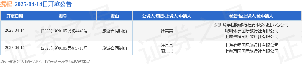 证券之星消息,根据天眼查APP显示,近日公布了2则上海携程国际旅行社有限公司作为被告/被上诉人的开庭公告,案由为旅游合同纠纷,开庭日期为2025年4月14日。详细内容如下: ......